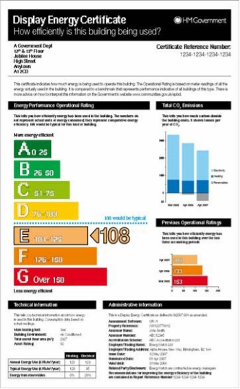 A Display Energy Certificate (DEC) shows the actual energy usage of a building, the Operational Rating, and it helps the public to see the energy efficiency of the building. This is based on the energy consumption as recorded by gas, electricity and other meters.